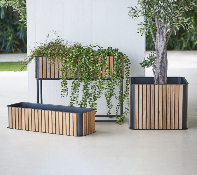 Combine je sodoben sadilnik v vznemirljivem dizajnu in mešanici materialov. Topel certificiran tik in poenostavljen aluminij s praškastim premazom dajeta edinstven videz, ki se prilega v večino prostorov. Cane-line teak je odobren in gojen v skladu s sistemom certificiranja SVLK. Posadite svoja najljubša zelišča, rože ali drevesa in dodajte zelenico svojemu zunanjemu prostoru. Prašno lakiran aluminij zagotavlja površino, odporno na udarce in praske.