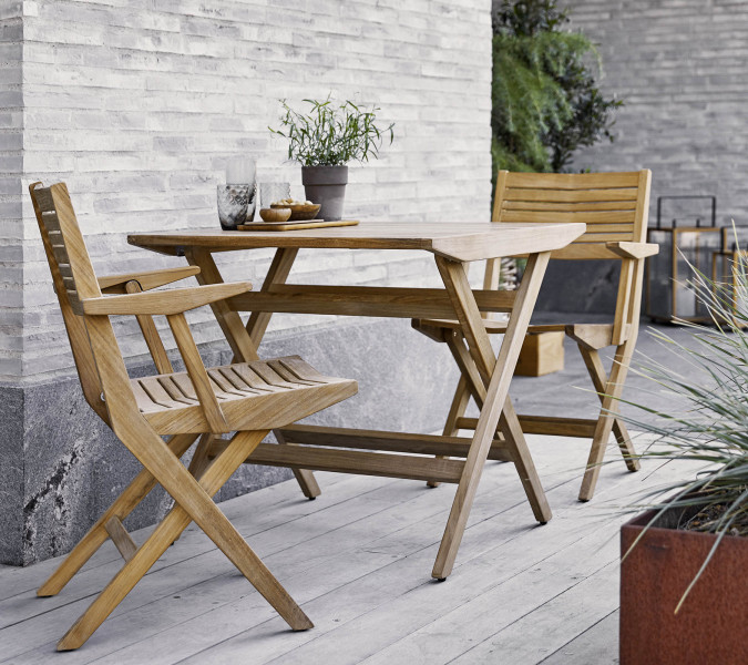 Flip je zložljiva miza iz tikovine in hkrati nova interpretacija klasičnih zložljivih miz s poudarkom na vrhunskem dizajnu in kakovosti. Toplina tika doda vabljiv sijaj preprosti in elegantni zložljivi mizi Flip. Idealna je za uporabo v manjših prostorih, balkonih in terasah z omejenim prostorom za shranjevanje. Mizo je oblikoval danski dvojec Strand+Hvass. Za ohranjanje čudovitega videza naravnega tika priporočamo redno vzdrževanje z uporabo izdelkov Cane Line Teak Care, saj vam bodo pomagali ohraniti lepo in toplo zlato rjavo barvo.