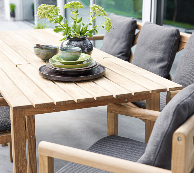 Jedilno mizo Grace je oblikoval danski oblikovalski dvojec Foersom & Hiort-Lorenzen MDD. Gre za reinterpretacijo klasičnega skandinavskega pohištva iz tikovine. Dizajnerski videz izraža čudovito ravnovesje med nordijsko čistimi linijami in moderno preprostostjo. Za skladen videz jo lahko kombinirate s klopjo in stoli iz kolekcije Grace ali z nekaterimi drugimi barvitimi jedilnimi stoli za živahnejši videz. Tik bo sčasoma pridobil srebrno sivo patino, če ga ne boste redno vzdževali, za kar priporočamo nakup naših izdelke Cane Line Teak Care, ki bodo poskrbeli za ohranitev prvotne zlato rjave barve.