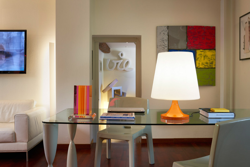 Ali Baba Stand je namizna svetilka, ki jo je oblikoval Slide Studio. Klasično senčilo kolekcije Ali Baba je podprta z lakirano aluminijasto podlago, ki je neobičajen material v produkciji Slide. Senčilo je iz polietilena s tehnologijo rotacijskega oblikovanja in je obogateno z dragoceno teksturo, ki spominja na arabeske motive. Namizna svetilka Ali Baba ima preprosto in minimalistično obliko in je primerna za sodobne trende opremljanja.