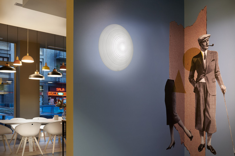 Stenska svetilka Morea s svojim ravnim in bistvenim dizajnom elegantno osvetljuje vse vrste poslovnih prostorov in ohranja ironijo izdelkov iz polietilena. Njegova oblika je bogatejša zaradi koncentričnih krogov, ki jih raztrgajo in ustvarjajo svetlobne učinke po vsej sobi.