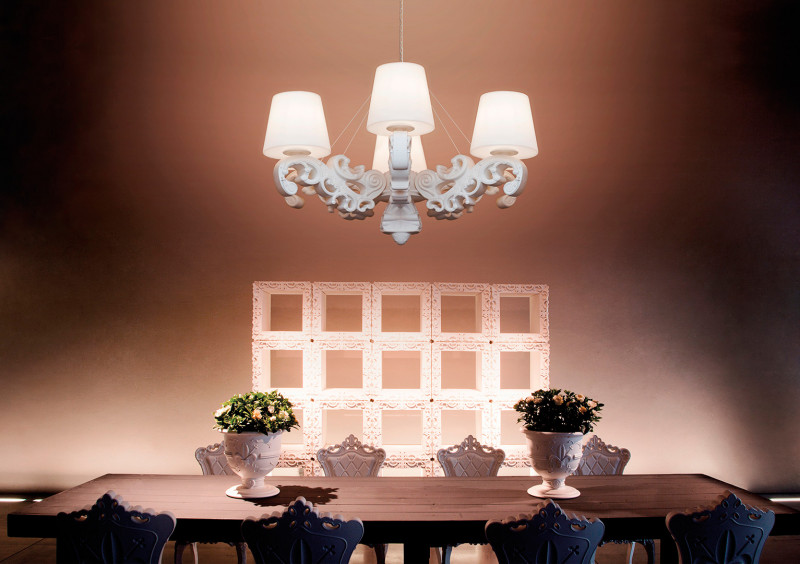 Kot celotna kolekcija Crown of Love je viseča svetilka bogata s podrobnostmi, značilnimi za italijanski baročni slog, ki se popolnoma ujema s pop in smešno dušo polietilenskega pohištva.