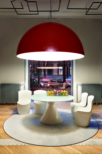 Elios, tanka viseča svetilka s premerom v treh različnih velikostih. Kontrast med močnimi barvami zunanje strani in toplo in jasno barvo notranje strani ustvarja svetlobne učinke v poslovnih prostorih in zasebnih domovih.