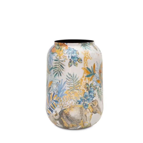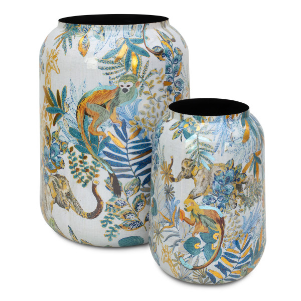 Ročno izdelan lahek aluminijast okrasni lonec izstopa s kobaltnim vzorcem džungle, gladko površino in okroglo obliko. Idealen za notranjo uporabo.